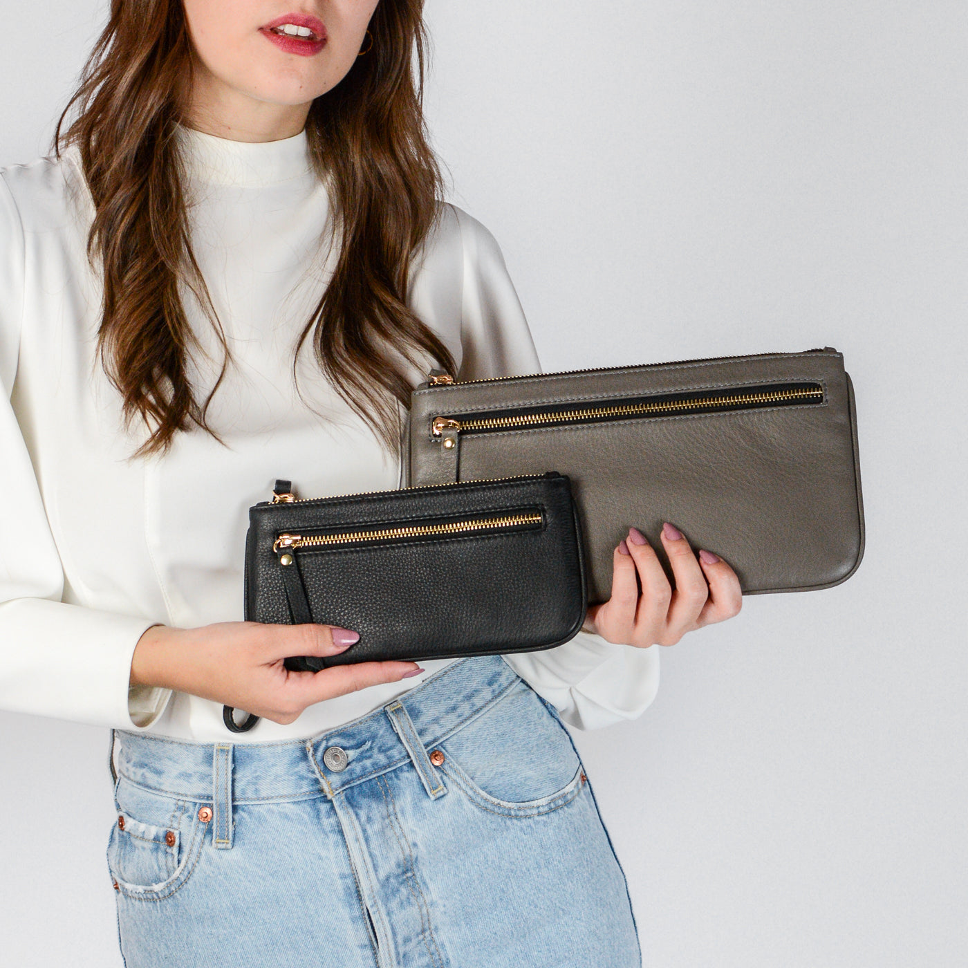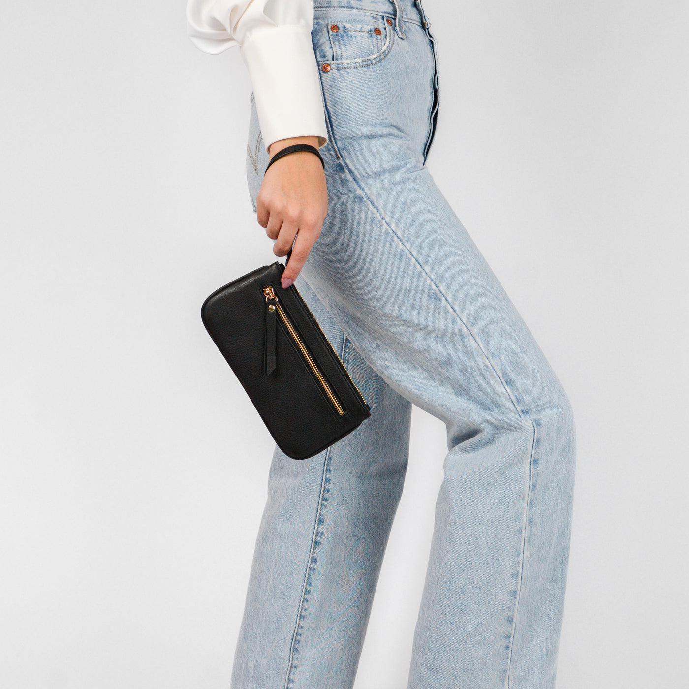 Handcrafted in full-grain leather and solid brass hardware with an outside zipper pocket, attached wristlet, and inside card pocket.