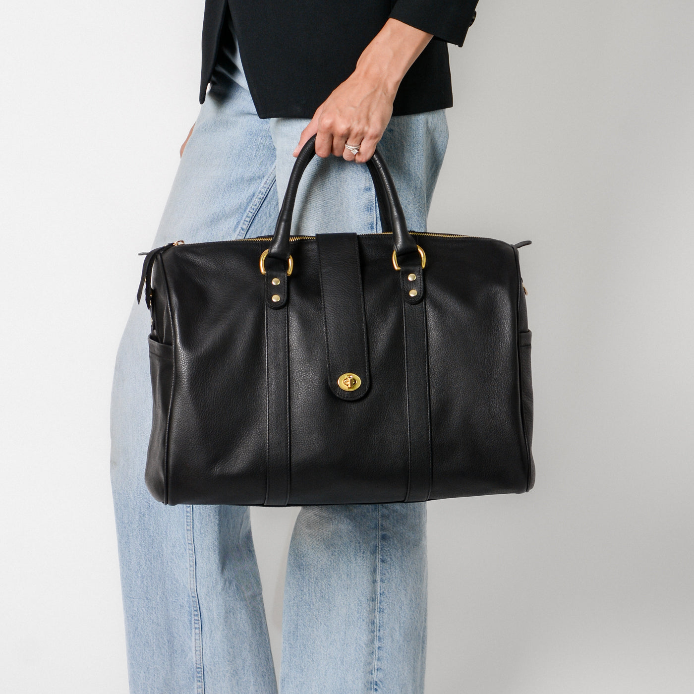 Materials: Full-grain leather, solid brass hardware, fully lined interior.