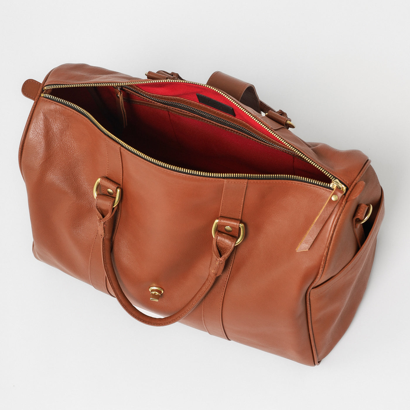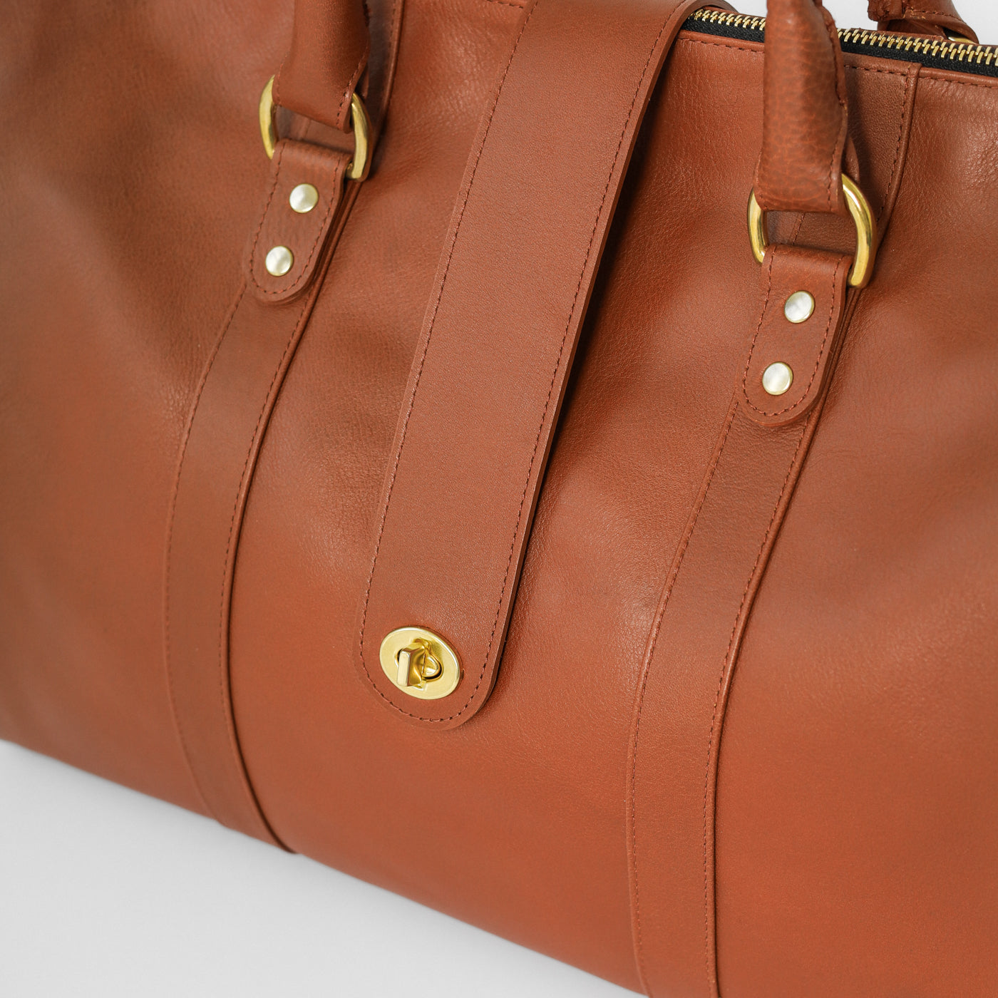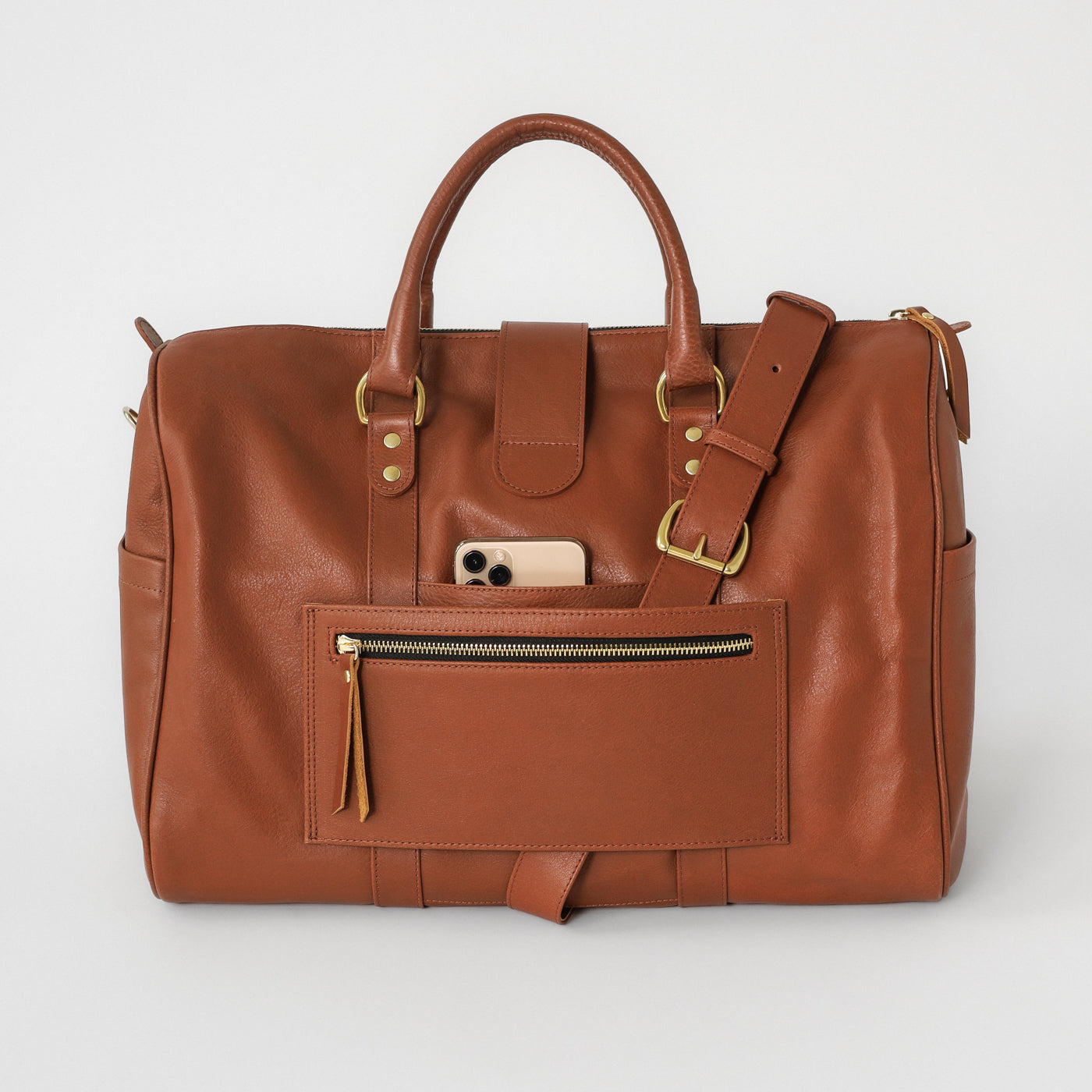 Handcrafted from premium full-grain leather and finished with solid brass hardware, it features a top-zip closure, double leather handles, and a detachable shoulder strap for versatile carry. The back panel includes a pass-through sleeve for your suitcase handle and a discreet zip pocket for your phone or passport.