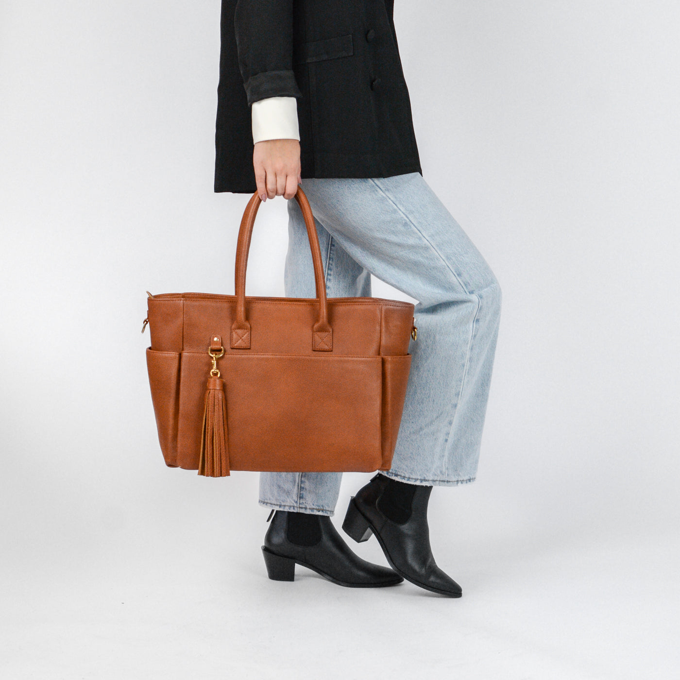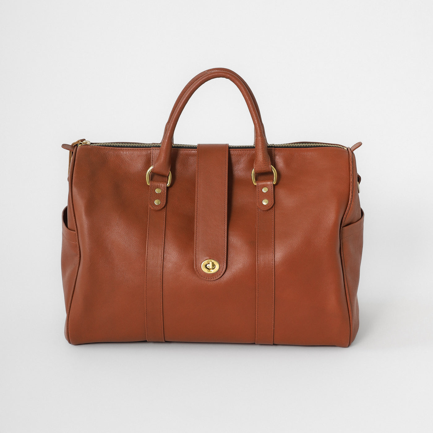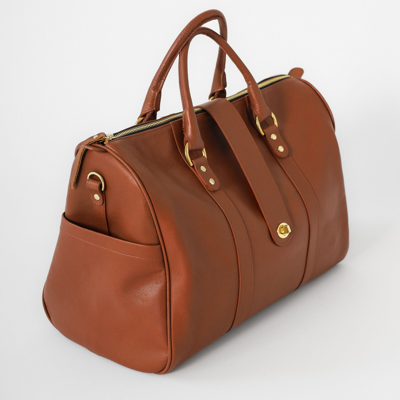 Handcrafted from premium full-grain leather and finished with solid brass hardware, it features a top-zip closure, double leather handles, and a detachable shoulder strap for versatile carry. The back panel includes a pass-through sleeve for your suitcase handle and a discreet zip pocket for your phone or passport.