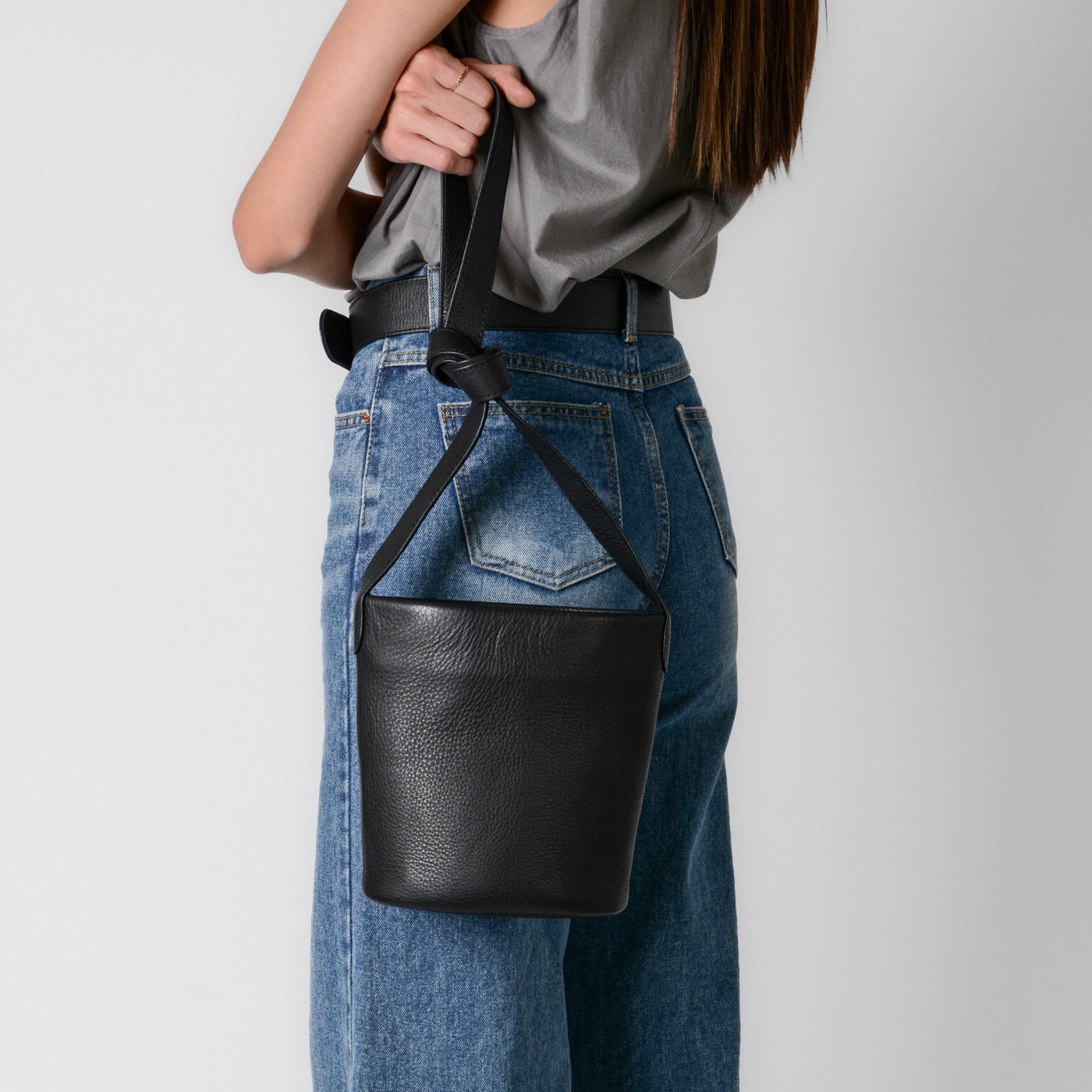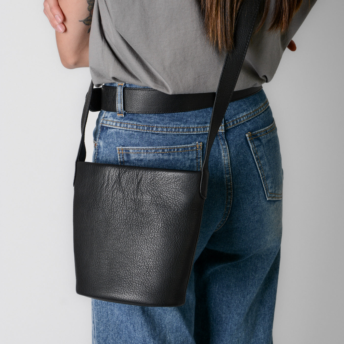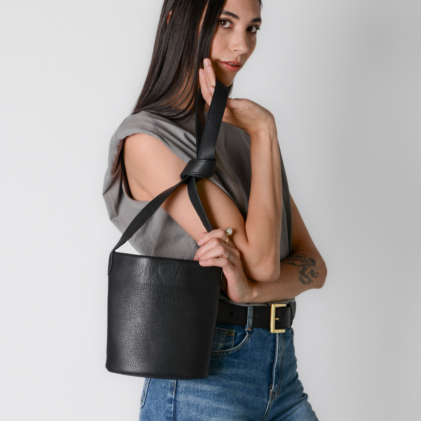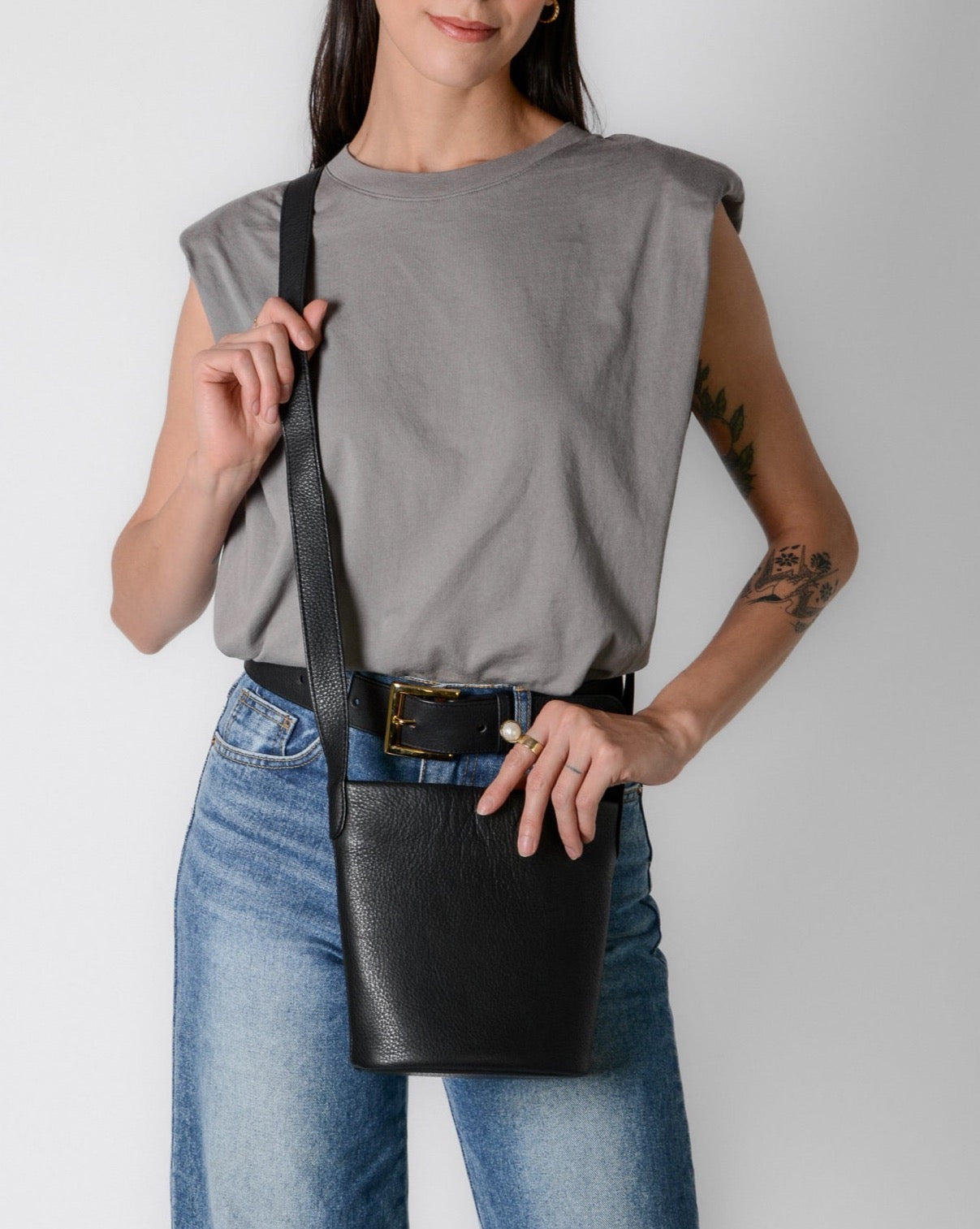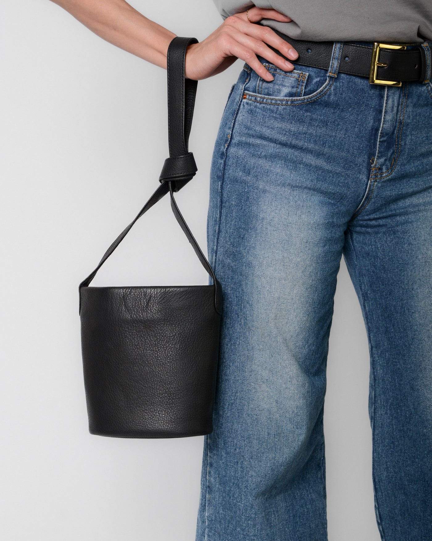 The Bucket Bag Petite by TAH is a timeless essential with a modern, column-inspired silhouette. Handcrafted from full-grain leather and finished with solid brass hardware, this compact design is perfectly sized to carry your phone, keys, wallet, and lipstick—just the essentials.