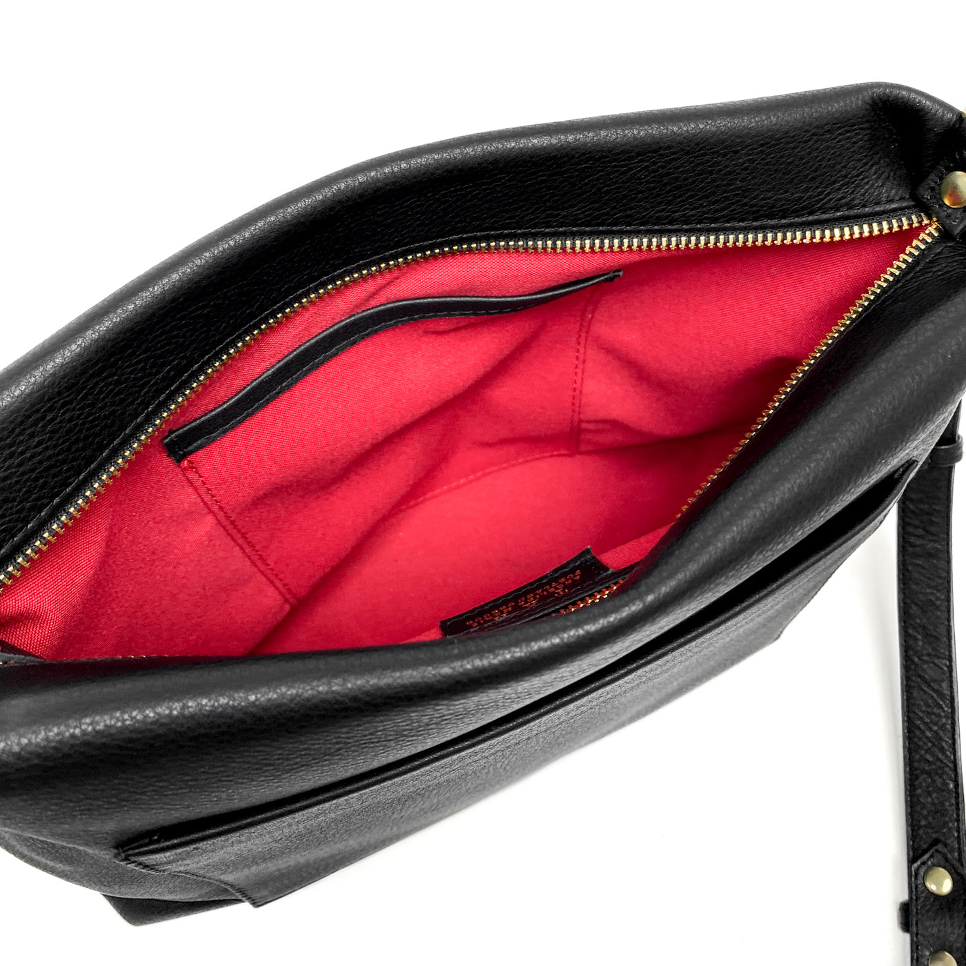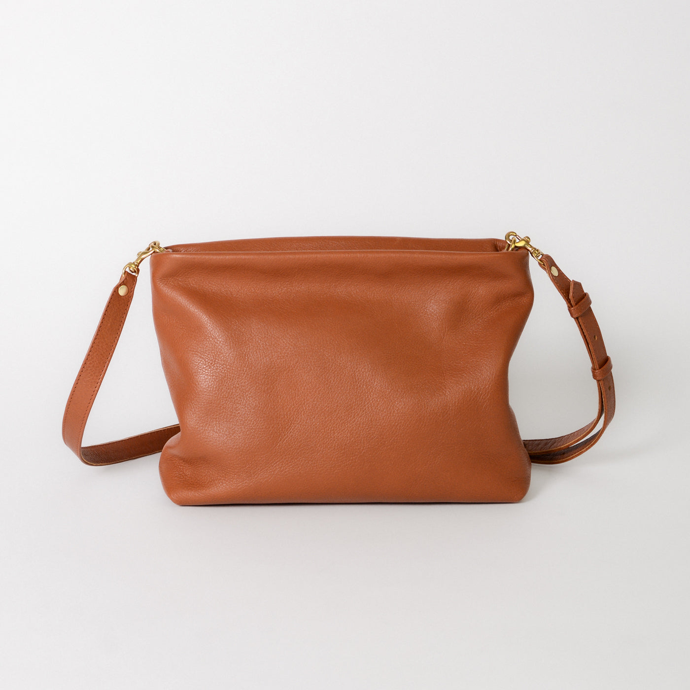 Full-grain leather exterior, lined interior with zip and slip pockets, premium zipper, solid brass hardware. Adjustable crossbody strap and removable shoulder strap.